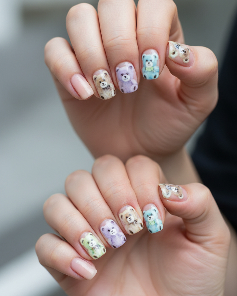 Manicura temática para manos de mujer con diseños pintados a mano de pequeños ositos: estilos adorables en colores pastel, detalles con brillo y sellado de gel para mayor durabilidad. Incluye preparación completa de la uña, aplicación del diseño y acabado protector, perfecta para un look divertido y femenino.